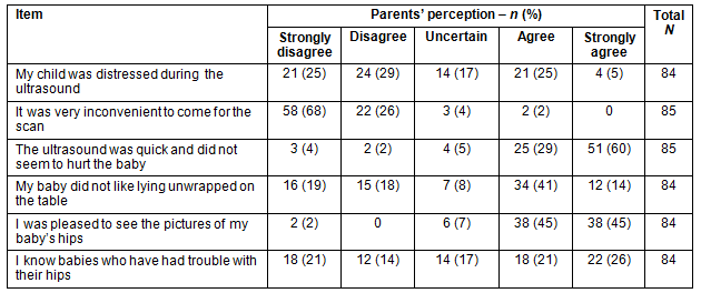 Only 2% of parents agreed that it was very inconvenient to attend the hospital radiology department for the ADUS, and 90% of participants reported they were pleased to see the pictures of their baby's hips (Table 1). Only 6% of participants did not agree that the ADUS was quick and did not seem to hurt the baby.
