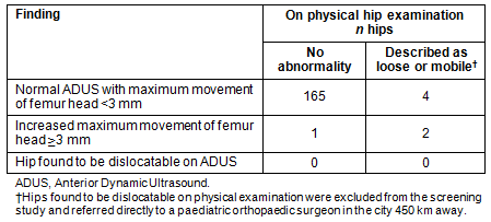 The maternity doctors identified three infants with hips 'loose/mobile' in the infants' medical records. One of these was confirmed by ultrasound (left 3.4 mm; right 4.1 mm), but the other two did not demonstrate abnormal movement under ultrasound (left 0.7 mm; right 0.6 mm vs left 2.2 mm; right 2.4 mm).