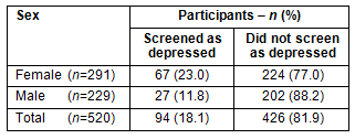 A 2 x 2 χ² was carried out to test whether there was a significant relationship between gender and depression. Altogether 23% of females and 11.8% of males screened positive for depression on the KADS (Table 1). The χ² value of 10.92 had an associated probability of p=0.001, df=1. However, Cramer's V was found to be 0.15, indicating only 2.25% of the variation in the frequency of depression can be explained by gender.