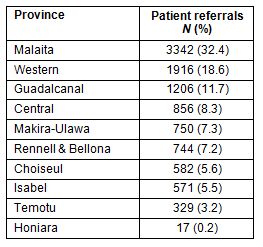 Over the study period 3342 patients (32.4%) were returned to Malaita Province and 1916 to Western Province (18.6%; Table 1). Provinces with smaller populations such as Isabel, Choiseul and Temotu had fewer referrals in absolute terms.