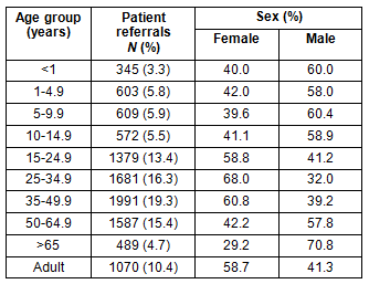 Children under 10 years of age comprised 15.1% of all referrals over the study period despite representing 28.1% of the total Solomon Islands population (Table 2)17. Young adults aged 15-34 years comprised 29.7% of those referred. Just over 10% of respondents were classified as being 'adults' without a specified age. Of the patients under 10 years of age, 59.4% were male. Among young adults of 15-34 years, 63.8% were female while among older adults aged 50 years and older, the majority of referred patients were male.