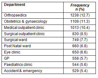 The most common inpatient ward or outpatient clinic to which patients were referred over the study period was orthopaedics with 1238 (12.7%) of all referrals following by obstetrics and gynaecology (1109; 11.3%) and the medical outpatient clinic (1013; 10.4%; Table 3). Accident and emergency comprised 5.4% of referrals. A number of departments including the tuberculosis, dental and psychiatric departments all received fewer than 5% of referrals.