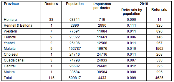 There was no consistent pattern at the provincial level between availability of doctors and rate of referrals. Provinces with the largest ratios of population size per doctor wre not those with the highest rates of referrals (Table 4). Makira, which has only one doctor serving its 38 584 people, had the third lowest rate of referral (0.008 referrals per person) of any province in 2010. Western province, with seven doctors for its 77 591 people (or one doctor per 11 084 people), had a higher referral rate of 0.011 referrals per person in 2010. Central, on the other hand, with only one doctor for 26 682 population (second highest population per doctor ratio), was the highest referring province after Rennell and Bellona.
