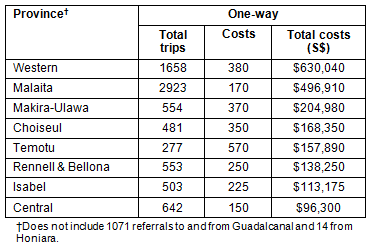 Table 5: Costs for referrals one-way by province, in Solomon Islands dollars, 2010