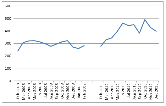 The return referrals per month are shown (Fig1), excluding accompanying family members. Referral patterns over 2008 were relatively flat while peaks can be seen in mid- and late 2010. November 2010 was the month with the highest number of returned referral patients (599).