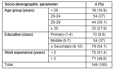 The socio-demographic profile of the ASHA workers is provided (Table 1). Out of the total 146 ASHA workers, 70 (47.9%) were below the age of 25 years. The minimum age of the ASHA worker was 17 years and the maximum age was 34 years. Sixty-seven (45.9%) of the ASHAs were educated below a secondary school level.
