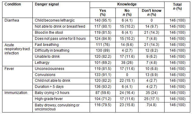 The ASHA workers' knowledge regarding danger signals in children requiring urgent referral is provided (Table 2). It was observed that despite training, 29 ASHAs (19.9%) did not feel the need to refer a child with diarrhoea who is unable to drink or breast feed. Similarly, in acute respiratory tract infections, 35 ASHAs (23.9%) did not know to refer a child with fast breathing. A total of 59 ASHAs (40.4%) considered a baby crying for more than 3 hours following immunization not worth referring to a first referral unit.