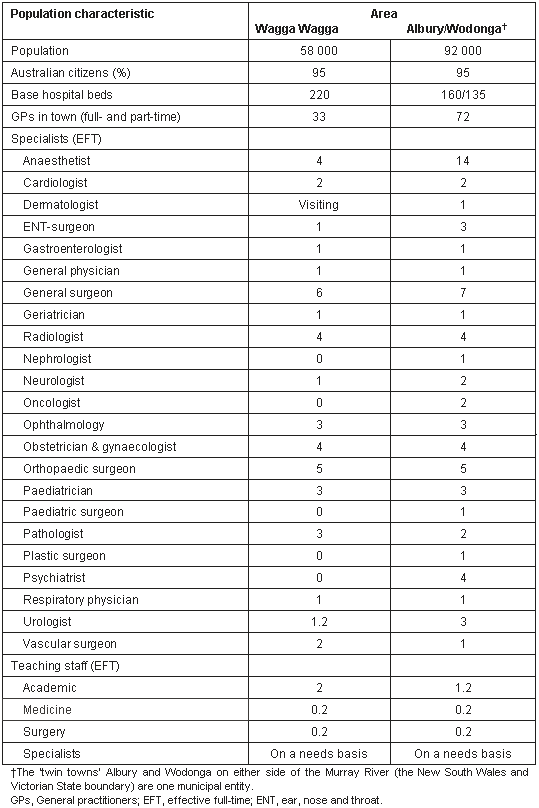 The program described was developed in the Greater Murray Clinical School of the University of New South Wales (UNSW), Australia, which was the first of the Commonwealth funded Rural Clinical School initiatives. The program began simultaneously in the school's two campuses in Wagga Wagga and Albury, NSW, in the year 2000 with students on rotation for year 4 (of a six-year course) and progressed to a cohort of 12 full-time students in 2001. Most of the early educational development described in this article took place at the School of Rural Health based at Wagga Wagga, with a major campus at Albury. The School lies within the area of the Greater Murray Area Health Service which covers an area equal in size to that of England and Wales and has a population of approximately 250 000 (Fig 1). The characteristics of the population are provided (Table 1).