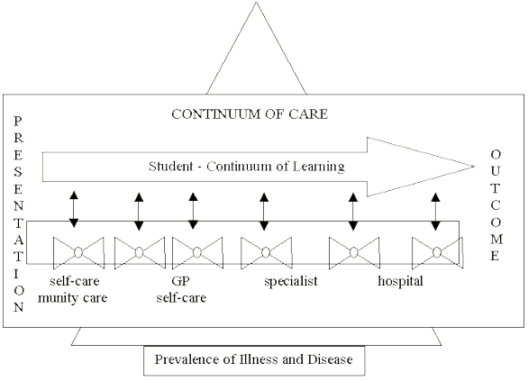 The basic approach of the program (termed the longitudinal, patient-centred method) was to introduce students to patients in community settings, ensuring that the students follow the progression of those patients' illnesses along the different pathways in the health-care system (Fig 2). From an educational viewpoint, this method of studying a few patients in depth has been shown to be more effective than seeing many patients superficially2. In addition to studying the patient's disease (the biomedical aspects of being unwell), sickness (the role of, and acceptance by society in relation to the unwell person), and illness (what the patient experiences) it was expected that students would explore the patient's semiotic (understanding the symbolism, meaning) needs of their illness(es). Thus, the somato-psycho-socio-semiotic model provided the educational philosophy underpinning the curriculum3.