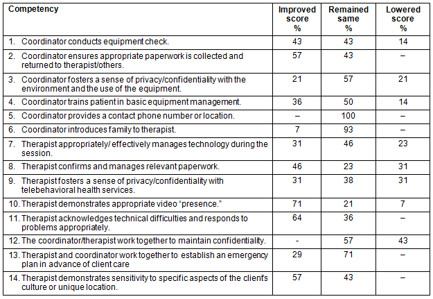 Participants demonstrated the most growth on competencies 2, 10, 11 and 14 (Table 1). Competency 2 involved identifying the importance of the coordinator ensuring appropriate paperwork is completed. Competency 10 involved identifying the need for the therapist to demonstrate appropriate video 'presence'. Competency 11 involved identifying the importance of the therapist acknowledging technical difficulties and responding to problems appropriately. Finally, competency 14 required understanding the importance of a therapist demonstrating sensitivity to specific aspects of the client's culture or unique location.