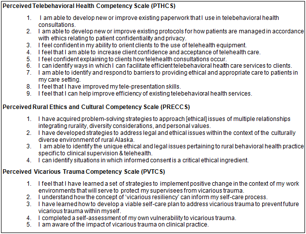 Responses from 17 participants who participated in the self-report portion of the study were analyzed. Participants completed the evaluative surveys at the end of the training program. Several participants had missing data on items assessing a particular construct and thus were not included in analyses of that construct. Results indicated excellent internal consistency reliability on the three constructs assessed: perceived telebehavioral health competency, perceived rural ethics and cultural competency, and perceived vicarious trauma competency α = 0.96, 0.91 and 0.92; n = 16, 17 and 15; SE = 0.015, 0.033 and 0.028; 95% CIs [0.93, 0.99], [0.84, 0.97] and [0.87, 0.98], respectively). Larger coefficient α scores suggest that items are more likely to contribute to a reliable scale. According to Nunnally and Bernstein, 0.70 and above is an acceptable reliability coefficient40. The lower limits of the confidence intervals, assessed through SPSS programming codes supplied by Iacobucci and Duhacheck, were all considerably above this criteria, giving greater confidence that the items contribute to a reliable scale41. It is reasonable to combine these related items into three separate scales: Perceived Telebehavioral Health Competency Scale (PTHCS), Perceived Rural Ethics and Cultural Competency Scale (PRECCS), and Perceived Vicarious Trauma Competency Scale (PVTCS) (Fig1).