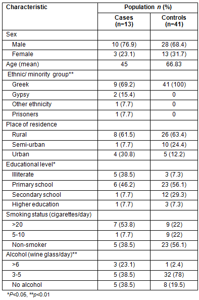 Thirteen newly diagnosed TB patients (cases) and 41 past-treated TB cases (controls) were included in the study. Thirty close contacts of the newly diagnosed TB patients and 111 close contacts of past-treated TB subjects were also included. Each case was matched to three controls according to age and sex. Significant statistical differences between the two groups were observed regarding ethnic/minority group (p=0.002) and educational level (p=0.039), with higher rates found among those who were illiterate and those who were Gypsies (Table 1). In the study, 69.2% of the cases and 87.8% of controls were permanent residents in rural and semi-urban areas, and most were illiterate, as determined by their level of education. In addition, 5 of 13 TB cases belonged to minority groups.