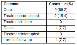 The treatment outcome of 13 cases who entered the MDOT program during the study period was analyzed. The treatment success rate was 11 (84.6%) cases (cured or treatment completed), one case (7.7%) died during treatment, one case (7.7%) was lost during follow up, and none interrupted treatment (Table 2).