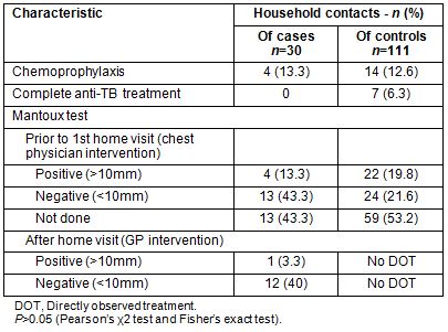 In four (16.6%) close contacts of TB patients, chemoprophylaxis was given by the GP. In comparison, 14 (12.6%) close contacts of the control group received chemoprophylaxis and seven (6.3%) a complete anti-TB regimen because of active TB (Table 3).