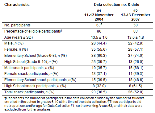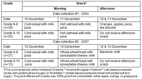 Table 2: Morning and afternoon snacks provided prior to data collection
