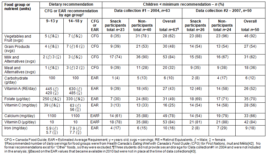 From the WEB-Q data, food group consumption and nutrient intake (from the 24 hour dietary recall) of students participating in the school snack program on the previous day were compared with students who did not participate for 2004 and 2007, respectively. Descriptive statistics (means, standard deviations, frequencies, percentages) were calculated. For both the food-group and nutrient datasets, multivariate analysis of variance (M)ANOVA was used to assess differences between groups (snack program participants and non-participants), and by gender and grade. Owing to the small sample size, grades were categorized into two groups with elementary students in grades six, seven, and eight versus high school students in grades nine and ten. Differences in grade were assessed because an afternoon snack was not offered to high school students (grades 9 and 10) and from past research indicating that older students tend to eat differently from younger students. Individual participant intakes were compared with current Canadian dietary recommendations for food groups and nutrients with an Estimated Average Requirement (EAR) value to determine the percentage of participants that were not meeting recommendations. The EAR has been used in dietary studies to describe the population prevalence of inadequate intakes. Data were analyzed using SPSS statistical software v18 (www.spss.com). Statistical tests were considered significant with p-values <0.05.