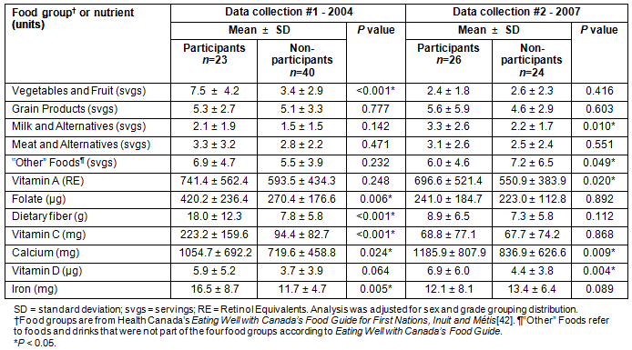 For Data Collection #1, students participating in the snack program (37%; n=23) had significantly higher (p<0.05) intakes for six of the 12 variables examined than those who did not participate (63%; n=40). For example, participants in the snack program had higher mean intakes of servings from the Vegetables and Fruit category (7.5 vs 3.4 servings) than non-participants. Mean values and differences in food group and nutrient intakes between participants and non-participants are shown (Table 4). Differences in intake also occurred by gender for Meat and Alternatives, calcium, and iron, by gender and grade for 'Other' Foods, vitamin A and dietary fiber, and by grade only for folate and vitamin C.