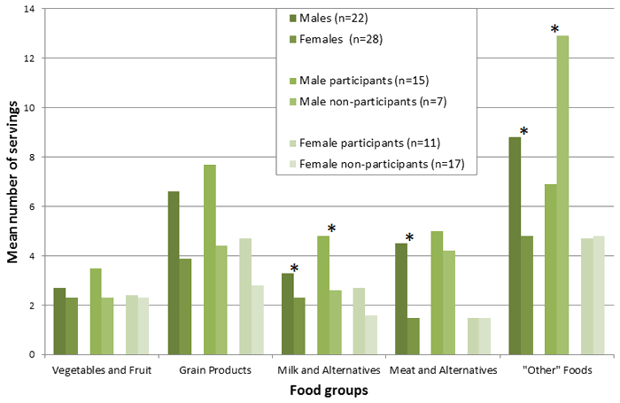 For Data Collection #2, students participating in the snack program (52%; n=26) had significantly higher intakes for five of the 12 variables examined than those who did not participate (48%; n=24) and with the exception of calcium, differed from the food groups and nutrients that were significant from the analysis for Data Collection #1. For example, participants in the snack program had higher mean intakes of servings from the Milk and Alternatives food group (3.3 vs 2.2 servings) as well as vitamin A (697 vs 551 RE [retinol equivalents]) and vitamin D (6.9 vs 4.4 µg) than non-participants. Vitamins A and D are nutrients that are added to most of the fluid milk sold in Canada. For Data Collection #2, differences in intake occurred by gender for nearly all the food groups and nutrients with the exception of Vegetables and Fruit, 'Grain Products', and vitamin C. Differences in food group intake are shown by sex for snack program participants and non-participants in 2007 (Fig1). There were differences by grade for Other foods, vitamin A, calcium, and vitamin D.