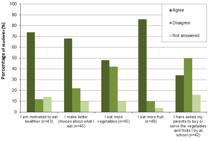 - Because of the school snack program... (Agree, disagree, not answered: I am motivated to eat healthier; I make better choices about what I eat; I eat more vegetables; I eat more fruit; I have asked my parents to buy or serve vegetables or fruits I try at school).