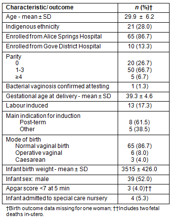 In total, 76 women were enrolled, however one woman was excluded from further analyses as she went into spontaneous labour prior to any testing being performed. Of the remaining 75 women participating in the study, the average age was 29.9 years (SD 6.2) and just over one-quarter of women (n=20, 27%) were nulliparous (Table 1). The majority of women (n=62, 83%) went into labour spontaneously and had a normal vaginal birth (n=65, 87%). The mean gestation at birth was 39+3 weeks (SD 4.6) and the mean birth weight of infants was 3515 g (SD 426).