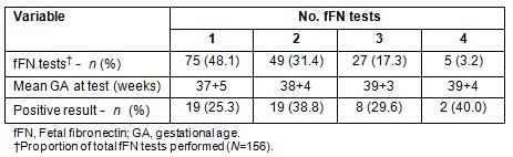 Table 2: Number of fFN tests undertaken, gestational age at testing and proportion of positive results