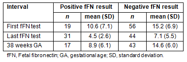 The number of fFN tests performed, the mean gestational age at each test and the result at each fFN test are described (Table 2). A total of 156 tests were performed. Most women (n=49, 65%) had more than one test performed (average tests 1.8, range 1-4). The mean interval from testing to birth according to the results of the first, last and 38 week fFN test is presented (Table 3).