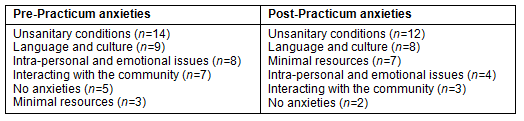 Anxieties: Students indicated a number of anxieties before the practicum, as detailed (Table 1). Anxieties typically focused on unsanitary conditions, language and cultural issues, and intra-personal issues. Some students were unsure of what to expect from the practicum - 'I'm not entirely sure what to expect. I'm nervous at this stage' [Pr19] - while others focused on issues such as 'being away from home' [Pr23, Pr24] or indicated anxiety about 'not knowing enough' [Pr12].