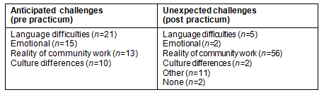 In the post-practicum questionnaires, only two students specifically mentioned emotionally-based challenges experienced on the practicum. Most challenges related to issues such as the reality of community work and coping with language barriers.