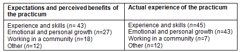 Table 3: Perceived benefits and expectations versus actual experience of the practicum