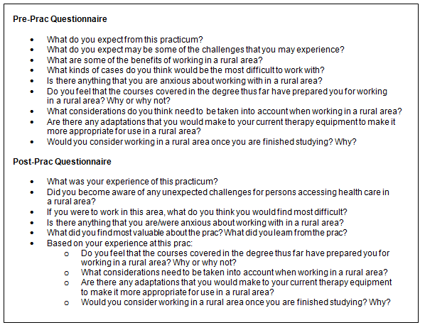 The study used qualitative methods of analysis to allow for detailed exploration of the students' insights. One week prior to the practicum, the students were required to complete an anonymous open-ended questionnaire (Fig2). This questionnaire explored aspects such as their expectations of the practicum; perceived challenges and benefits of working in rural communities; expectations of the type of cases they might encounter; perceptions of preparedness for the practicum; considerations that might need to be taken into account when working in rural areas; and adaptations that may need to be made to therapy equipment. Immediately after the students' return from the practicum, they completed a follow-up questionnaire that probed the same areas as the pre-practicum questionnaire, which enabled the authors to note how exposure to rural community work through a practicum shaped students' responses to the realities of working in these contexts (Fig2). The questionnaires were based on both local and international literature that documents some of the most common difficulties facing new graduates working in challenging contexts, as well as on the authors' own anecdotal experiences of coordinating community work practica14,15,23.