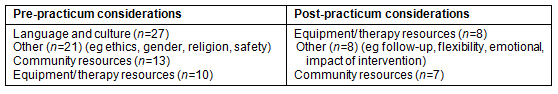 It was interesting to note that 5 students pre-practicum and two students post-practicum listed no anxieties. For some students, the desire to make a difference and the challenges presented by the practicum may have overridden any sense of anxiety. However, the apparent lack of anxieties among some students is concerning given the fact that the challenges posed by rural community work can be anxiety-provoking and emotionally draining even for qualified and experienced therapists.