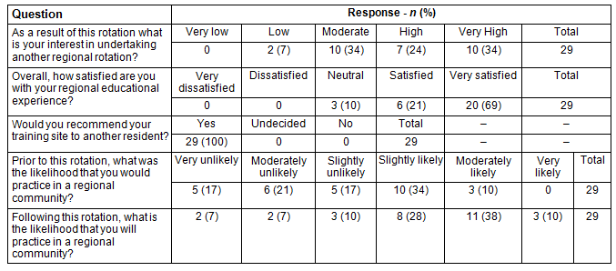 A total of 73% (29) of residents replied to the survey. Most residents were in their second year of training. The breakdown of responses between the training year and discipline are provided (Table 1). Because of the number of respondents and the wide variety of specialties represented, the analysis focuses on three main groups: General Surgery, General Internal Medicine and All Other Specialities (including anaesthesia, paediatrics, orthopaedics, nephrology, pathology and haematology). For this report, survey results were organized into three sections: overall resident satisfaction and recommendation; resident interest in a future rural rotation; and likelihood of the resident practising in a regional community. The survey questions and responses are provided (Table 2).