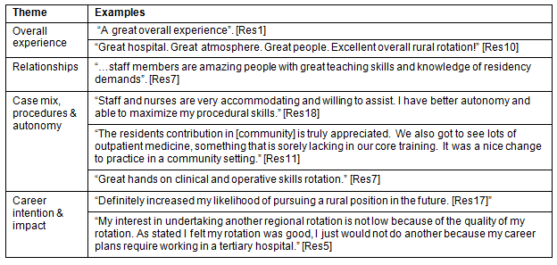 The analysis of the qualitative comments provides insight into these positive quantitative results. Qualitative analysis of the free text comments revealed four major themes (Table 3). There was a strong positive sentiment for the overall experience followed closely by the collegiality in relationships with medical and hospital staff.