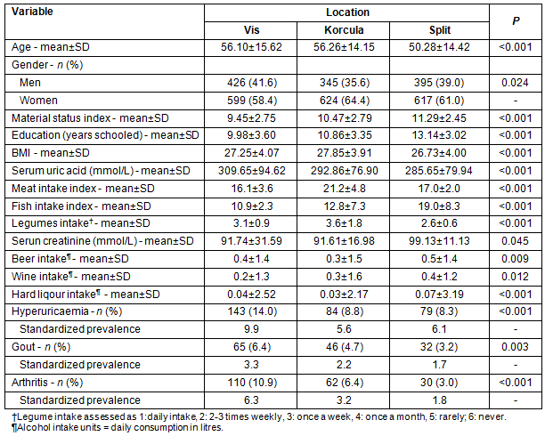 This study included a total of 3006 participants in three cohorts: Vis (N=1025; 34.1%), Korcula (969; 32.2%) and Split (1012; 33.7%). The age and sex structure of the three sub-samples differed (Table 1). Similarly, the prevalence of gout, hyperuricaemia and arthritis were also different, with even stronger differences recorded in the age-standardized prevalence (Table 1). The mean serum uric acid showed a similar trend with the highest values in the population of Vis, intermediate in the population of Korcula and the lowest values in the population of the coastal city of Split (Table 1). A comparison of basic socioeconomic characteristics indicated that the Vis sample was least favourable on this parameter, while the Split sample was most favourable (Table 1). Multivariate analysis for hyperuricaemia, gout and osteoarthritis indicated that those on the most isolated island, Vis, had significantly higher odds for hyperuricaemia, compared with inhabitants of the city of Split, similar (insignificant) odds for gout, and increased odds for osteoarthritis (Table 2). The less isolated island of Korcula had higher odds only for osteoarthritis, compared with Split city (Table 2).