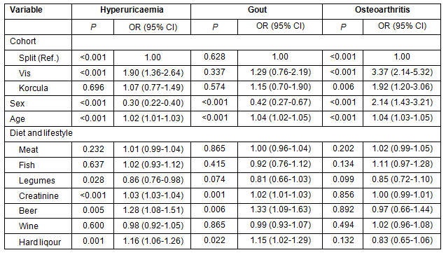 Table 2: Predictors of the hyperuricaemia, gout and osteoarthritis in logistic regression models