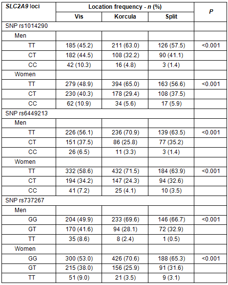 Analysis of allele frequencies of the three loci within SLC2A9 indicated significant differences across the study sample, with the highest proportion of deleterious genotypes (rare homozygotes) in Vis, an intermediate proportion in Korcula and the lowest in Split (Table 3).