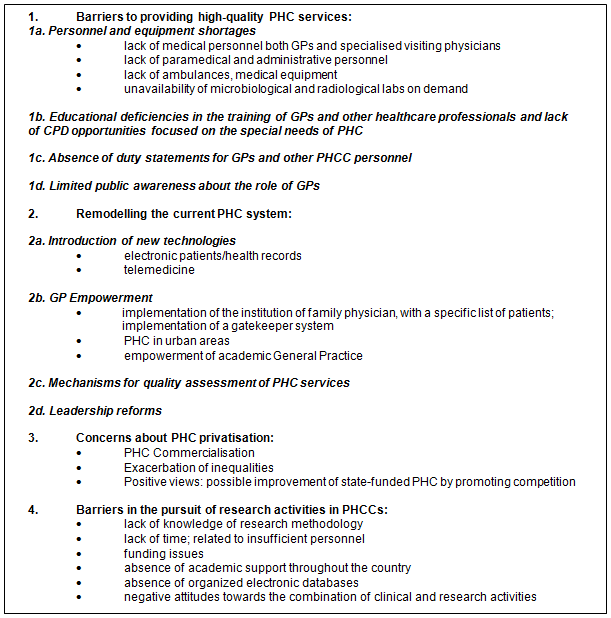 There was discussion about how PHCC services should be developed. Participants suggested: the introduction of new technologies; GP empowerment (implementation of the family physician with a specific patient list along with the gatekeeper system, PHC in urban areas, empowerment of academic general practice); leadership reforms (economic and administrative independence from hospitals); and mechanisms for quality improvement and assessment (eg the implementation of clinical audits).