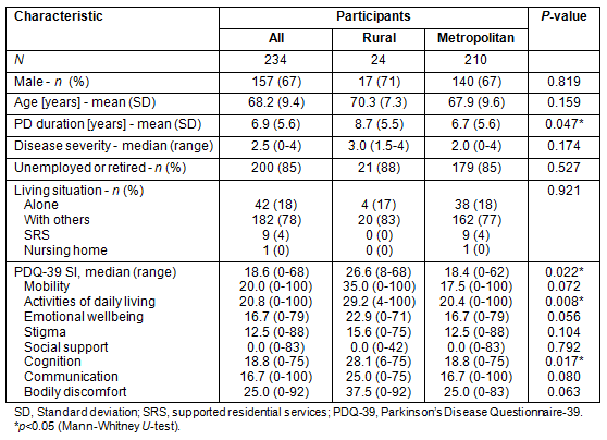 The characteristics of the participants with idiopathic PD living in metropolitan Melbourne and rural Victoria are presented (Table 1). In order to ensure that the characteristics of individuals living in rural Victoria were comparable to the metropolitan sample, one individual with a modified HY Stage 5 was excluded from the analysis. Two rural participants were also excluded because they scored less than 24 on the MMSE. There were no significant differences in age, sex, employment status, living situation and disease severity between participants in the rural and metropolitan samples. Nevertheless, participants with PD in rural areas had a significantly longer mean disease duration compared to participants living in metropolitan Melbourne.