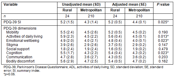 Both groups reported less impairment in the dimension of social support. Given that participants in the rural sample had significantly longer PD duration, a one-way analysis of covariance with disease duration as a covariate was conducted to determine whether there was a significant difference in HRQOL. After controlling for disease duration, there was a statistically significant difference in overall HRQOL as measured by the PDQ-39 SI (Table 2). A significant difference was also observed between the two samples for the PDQ-39 dimensions of ADL, emotional wellbeing and cognition.