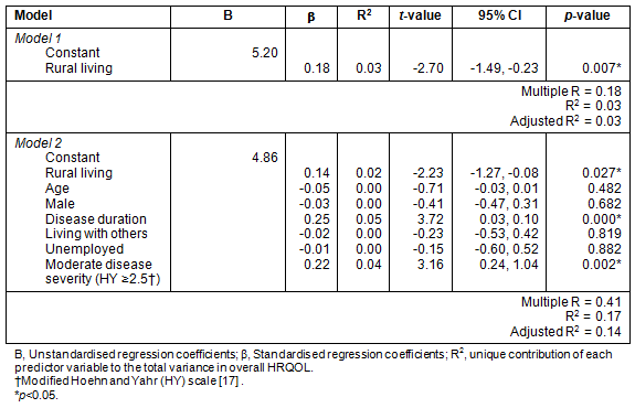 Rural living was found to be a significant negative predictor of HRQOL (β=0.14; 95% CI -1.27 to -0.08; p=0.027). It significantly contributed to the variance in HRQOL in both models, although it had a smaller contribution (2%) when other predictor variables were included. The final model accounted for 14% of the variance in HRQOL. The most important predictive factor was disease duration, which accounted for 5% of the variance in PDQ-39 SI scores. Moderate disease severity (modified HY Stage ≥2.5) was also a contributing factor, accounting for a further 4% of the variance in HRQOL. None of the interaction effects that were examined were significant at an alpha level of 0.05. As the interaction effects contributed less than 1% of the variance in HRQOL, the results for the regression analyses without the interactions between rural living, disease severity and disease duration have been presented (Table 3).