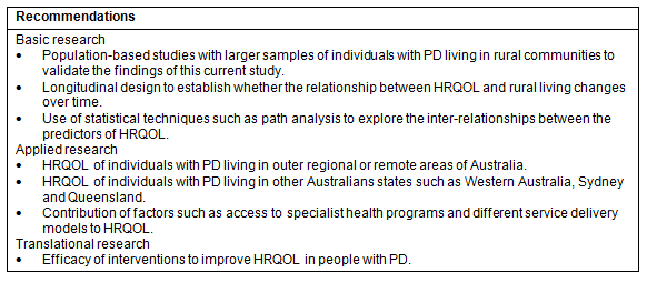 The main limitation of this study was the small sample of participants who were recruited from rural Australia. Another limitation was that the sample from metropolitan Melbourne may have perceived their HRQOL differently compared to the broader population of Australians with PD as they volunteered to participate in a physiotherapy exercise trial. In order to validate the findings of this study, further investigations with significantly larger sample sizes are required. Participants were also sampled predominantly from communities classified as inner regional areas in accordance with the Australian Standard Geographical Classification - Remoteness Areas system15. Thus, the rural sample might not have reflected the true population of people with PD living in rural Victoria. Further sampling of individuals living in outer regional or remote areas and other parts of Australia are needed to confirm and extend the generalisability of the current findings. Additionally, the same inclusion criteria were not applied to both samples because participants living in rural Victoria were not required to participate in a physiotherapy intervention program. No previous studies, however, have examined the HRQOL of Australians with PD living in rural communities. The significant association between rural living and poor HRQOL in Australians with PD highlights the need for further work in this area. Recommendations for future research are summarised, and include basic, applied and translational research (Fig1).