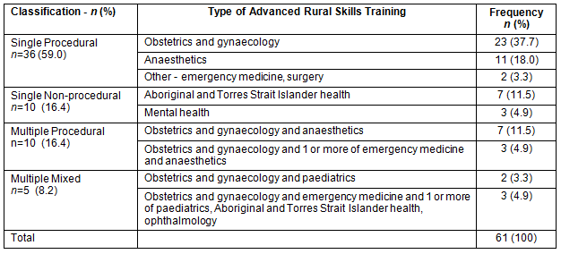 Results: Sixty-one completed questionnaires were returned resulting in an unadjusted response rate of 51.7%. Respondents had completed a range of training posts: obstetrics and gynaecology (37.7%), anaesthetics (18%), anaesthetics and obstetrics and gynaecology (11.5%) and Aboriginal and Torres Strait Islander health (11.5%). Thirty-nine respondents (63.9%) were using skills related to their advanced training at the time of the study. In the first 5 years after training, the percentage of doctors using their advanced rural skills decreased from 75.4% to 61.1%. The year directly following advanced training was rated as 'critical' or 'very critical' in their future career choices by 68.9% of respondents. However, ratings of the quality of support received in that year were varied, with 21.4% reporting 'very poor' support. There was a statistically significant association between ratings of support in the year directly following training and the use of skills 3 years after training (χ2 = 8.715, df = 2, p = 0.013).