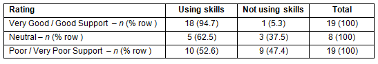 There was a statistically significant association between ratings of support in the year directly following training and whether doctors were using their skills 3 years after training (χ2 = 8.715, df = 2, p = 0.013). Doctors were more likely to be using their advanced rural skills 3 years after training if they had reported 'good' or 'very good' support in the year directly following training, compared with those who reported poor support (Table 2).