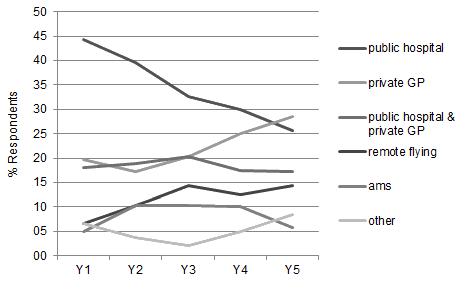All respondents had practice history for at least one year after training. Fifty-eight respondents had 2 years of practice history, 49 had 3 years, 40 had 4 years and 36 (59%) had practice history for a full 5 years after training. The most common organisations in which respondents practice during the first 5 years after ARST (Y1-Y5) were: public hospital (including primary health care & specialty clinics); private general practice; a combination of public hospital and private general practice; remote flying services; and Aboriginal Medical Services. Other organisation types included: private hospital; private general practice sub-specialty; university; and non-government organisations. The percentage working in public hospitals declined gradually from 27 (44.3%) in the first year after training (Y1) to 9 (25.7%) 5 years after training (Y5) (Fig2). In comparison, the percentage working in private general practice (Y1 = 12, 19.7%; Y5 = 10, 28.6%) and remote flying (Y1 = 4, 6.5%; Y5 = 5, 14.3%) increased over the first 5 years after training.