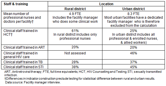 In this study two indicators were specifically modified to maximize their relevance to the rural context, which meant they could not be compared with the urban findings. These are 'Mean number of professional nurses and doctors per facility' and '% clinical staff trained in HCT'. The primary purpose informing the evaluations was to provide locally-relevant data as part of a district-led quality improvement process. Both districts had strong management teams committed to quality improvement. While the results are thus not representative of all rural and urban districts in South Africa and cannot be generalized the findings in these two districts, as an instance of HIV/TB integration, nevertheless throw up interesting issues for discussion and have important policy implications.