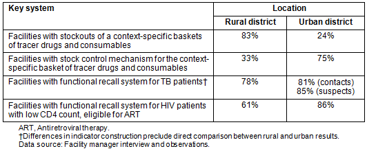 Training coverage was fair, as shown (Table 1); however, there were many instances, especially in smaller rural facilities, where no-one had been trained in a particular service component. Assessment of system capacity is shown (Table 2). Stock-outs of drugs (ie no supply of drugs in the facility) were much more extensive in the rural district than the urban district (83% vs 23%, respectively, of the setting-specific basket of tracer drugs and stocks). In part this could be attributed to weaker stock control systems which could be addressed by facility-level action, but further enquiry also suggested deficiencies at district level related to transport logistics, and at regional and provincial level related to bulk procurement of drugs.