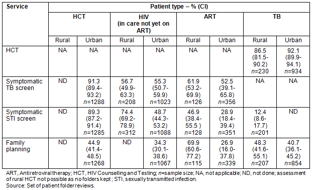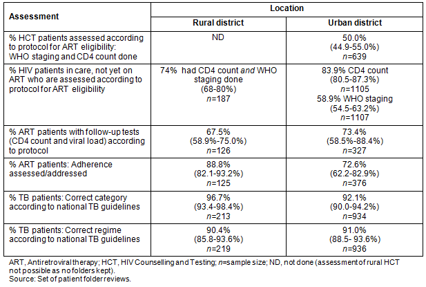 A variety of data collection tools were used. The first part of a structured facility manager interview was self-administered by each facility manager or their nominated second-in-charge and was used to collect information on staffing and training. The second part of the structured facility manager interview was administered by the evaluation team. The team sought evidence of functional recall systems (defined as a locally-appropriate process with responsibility allocated to a person in a specific position and keeping to a pre-set time schedule for recall and follow up of patients who did not respond to original recall) and evidence of a drug stock control mechanism (a paper or electronic system with at least minimum and maximum stock levels and a defined trigger for ordering more drugs). Data collection tools further included a review of data in the routine health information system, an observational checklist for availability of drugs, equipment and supplies, and a series of patient folder (health record) reviews which collected clinical data on access and quality of care. The variables measured in the first part of the facility manager interview were all integers, and for the other tools the variable responses were 'yes', 'no' or 'not applicable'. Ten folders for review were randomly sampled from each of the following registers in each facility: HCT, antiretroviral therapy (ART) and TB. HIV patients who were in care but not yet receiving ART were sampled from the HCT register which shows which patients test positive. Their clinical notes were then reviewed to verify that they were in care (defined as at least two clinical visits) and not yet receiving ART. It was not possible to perform a full patient folder review for patients accessing HCT in the rural district because a patient folder was not issued for this service and notes were only kept in the HCT register.
