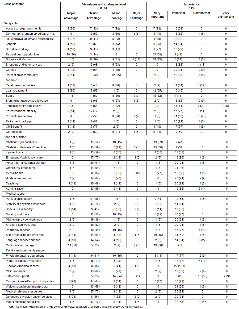 As noted, 11 CHC administrators and 11 CHC physicians who had leadership roles in recruitment and retention participated in this study and completed a CHC CAQ in a structured interview format. The overall responses (n=22) for the CHC CAQ are provided (Table 1). The following sections describe the results for advantages and challenges ratings, importance ratings and Apgar scores by class.