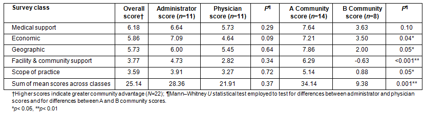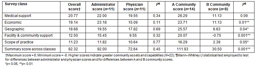 The following algorithm was used to calculate the Community Apgar score from advantage/challenge and importance scores: Community Apgar score = advantage/challenge score × importance score. The Community Apgar score ranges from -8 to 8 with a higher score indicating a more developed community asset and capability related to recruitment and retention of physicians. Statistical difference of these scores by class was determined between respondent and community types.