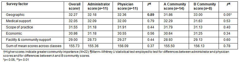 The importance mean scores for the five classes within the CHC CAQ are provided (Table 3). Table 3 also contains p values for the statistical tests across occupation and community types. Class scores were calculated by summing scores across all 10 factors in a class. A summary score across classes was constructed by summing the scores across classes in the CHC CAQ. Geographic was identified as the highest area of importance for the communities followed by medical support, scope of practice, economic and facility/community support. There were no significant differences between CHC administrator and physician scores either within or across classes. Comparisons between community types showed that B communities had significantly higher scores for the geographic class (p=0.05). There was no across class significant difference in scores for A and B communities.